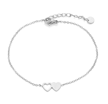 Zilveren armband met dubbel hartje. 16 cm lang en kan nog eens met 4 cm verlengd worden. Gemaakt van hoogwaardig stainless steel. Dankzij het verlengstukje is de armband verstelbaar en geschikt voor verschillende polsmaten. Twee armbanden in één om te delen met een vriendin of geliefde.