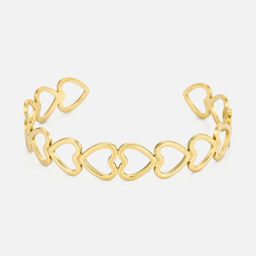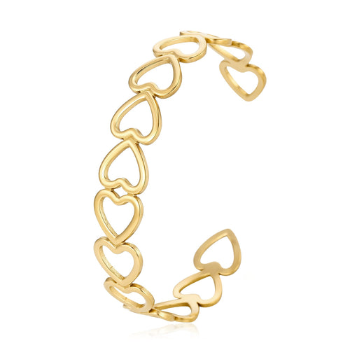 Gouden bangle armband verbonden hartjes. Is ongeveer 50mm x 60mm en te buigen naar grotere of kleinere maat. Gemaakt van hoogwaardig stainless steel. Deze goudkleurige bangle is zeer goed te combineren met andere gouden sieraden.