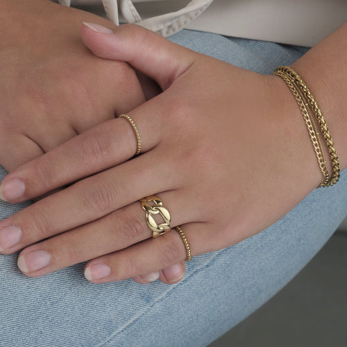 Gouden statement ring. Verstelbaar naar jouw gewenste maat. Gemaakt van hoogwaardig stainless steel. Grove schakel ring.