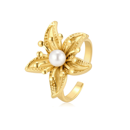 Gouden ring lelie parel. Verstelbaar naar jouw gewenste maat. Gemaakt van hoogwaardig stainless steel.