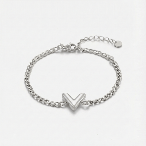 Zilveren schakel armband met V. 16 cm lang en kan nog eens met 4 cm verlengd worden. Gemaakt van hoogwaardig stainless steel. Dankzij het verlengstukje is de armband verstelbaar en geschikt voor verschillende polsmaten.